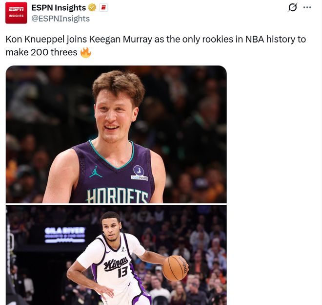 纪录四:新秀赛季已经命中201记三分升至NBA新秀历史第二,仅次于基根穆雷的206记,按照克努佩尔的表现,他反超并大幅提升这一纪录只是时间问题;