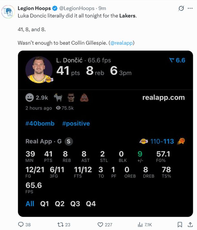 ESPN晒出布克、狄龙两个核心在场下看戏,东契奇还拿到41+8+8的数据还是湖人输,本赛季太阳面对湖人3胜1负。