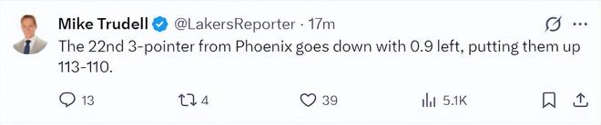 湖人队记迈克-特鲁戴尔:在终场前0.9秒湖人居然让残阵太阳命中第22个三分球。